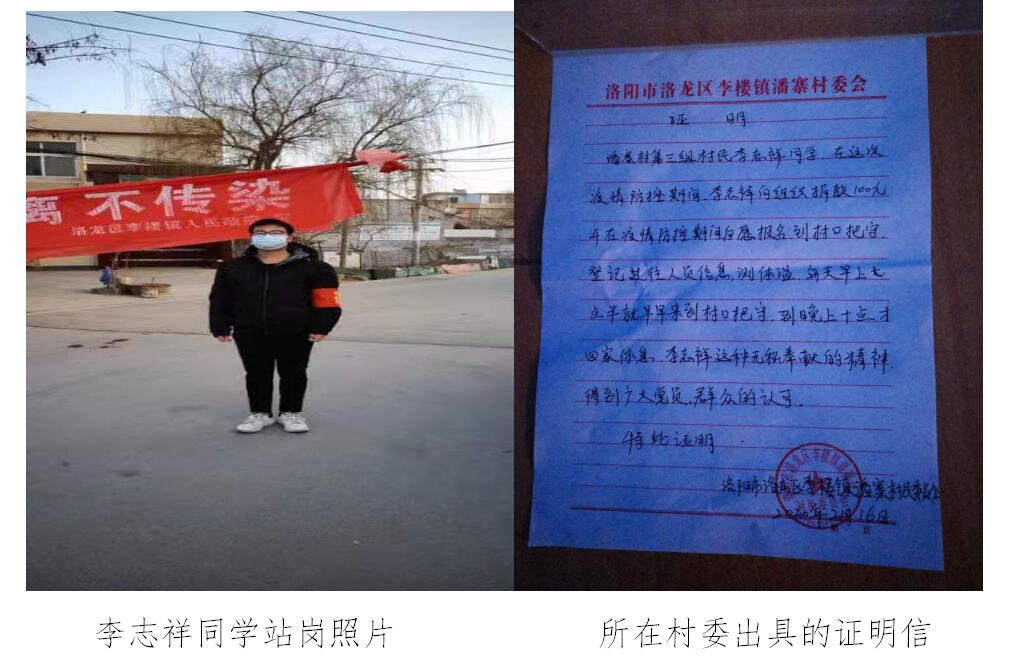 17级中专计算机二班李志祥同学作为一名中专学生虽然年纪小,当疫情发生后,他不仅积极捐款还主动到洛龙区李楼镇潘寨村村委报名成了该村防疫队伍中成为了最年轻、最朝气的战“疫”志愿者。从2月11号至今,每天7点半到岗,晚上十点才回家,在村口把守,管理过往人员,负责登记信息并测量体温,每天防控值守超14个小时,但从不叫苦喊累,一直坚守岗位,得到了村委的高度赞扬。
