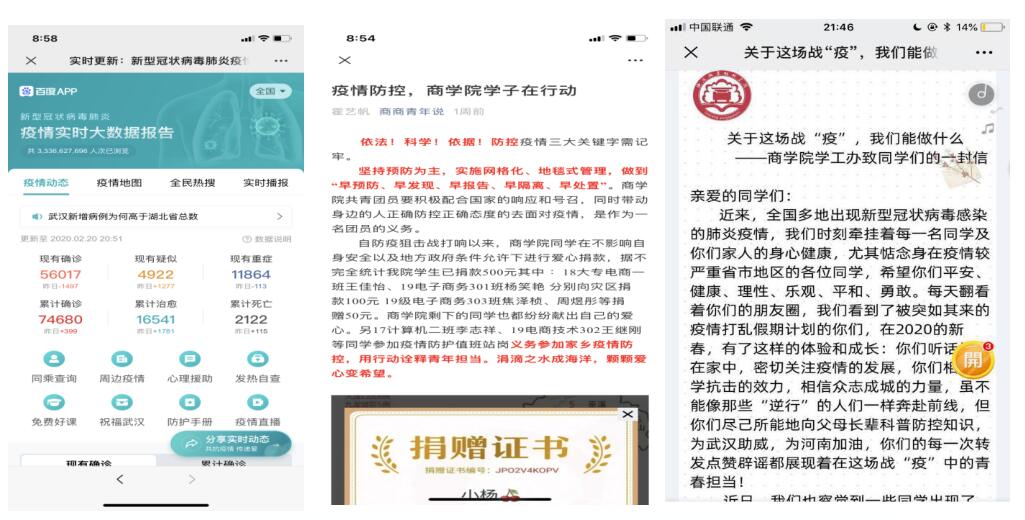 重视网络教育,加强思想引领。澳门金年会app下载官网通过多种网络平台面向全院学生及时推送校内外官方主渠道信息,让学生在自己熟悉的网络阵地针对疫情知识“学起来”“用起来”,科学认识,理性应对。澳门金年会app下载官网学工办根据疫情防控的不同节点,专门开设“疫情状况”专栏,实时更新相关防控动态信息;及时编辑推送《关于这场战“疫”,我们能做什么——澳门金年会app下载官网学工办致同学们的一封信》《疫情防控,澳门金年会app下载官网学子在行动》等等关于加强疫情防控有关工作的推文,教育引导学生科学理性认识和应对疫情,不信谣、不传谣,引导学生服从防控大局、服从学校管理,倡议学生合理安排假、做好学习规划。