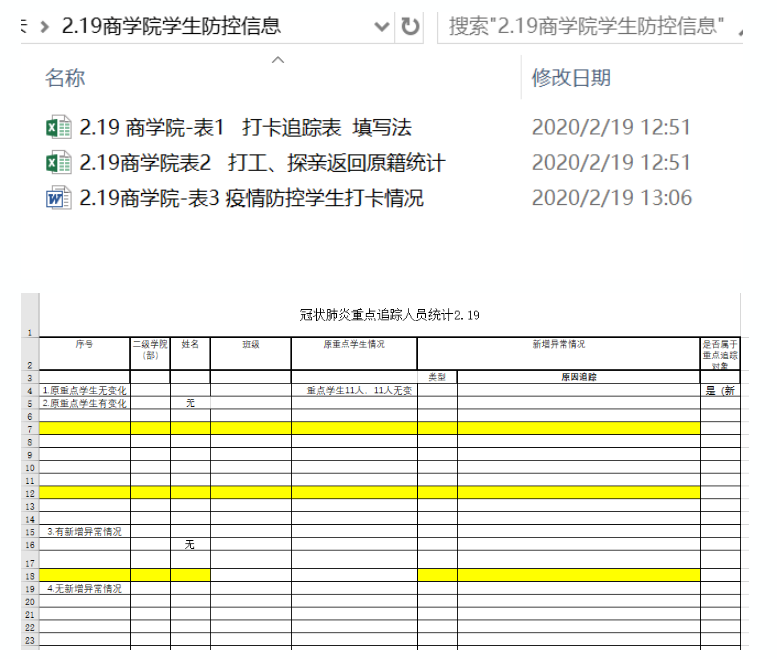 自1月21日起学校实行防疫零报告的信息日报制度,面对“三定一聘”时间不长,部分工作尚未理顺,学生类型多,学籍构成复杂,学工队伍薄弱的种种现实问题,澳门金年会app下载官网秉持“全面覆盖不漏一人”原则,学工办三人建立起一支队伍,带领班主任与学生逐一联系,确认学生身体状况,通过班级微信上报和“完美校园”网上打卡的全面覆盖、双线摸排,精准掌握了所有学生的每日活动轨迹和身体状况。同时重点关注三类人群:重点区域(一省八市)学生、外出实习学生及假期外出打工、探亲滞留学生的情况,建立重点关注学生台账。同时对在“完美校园”网上打卡有异常变动的学生,一一追踪,不留死角,并由辅导员每日一对一联系、动态监控,填写《学生新型肺炎防控信息追踪表》。