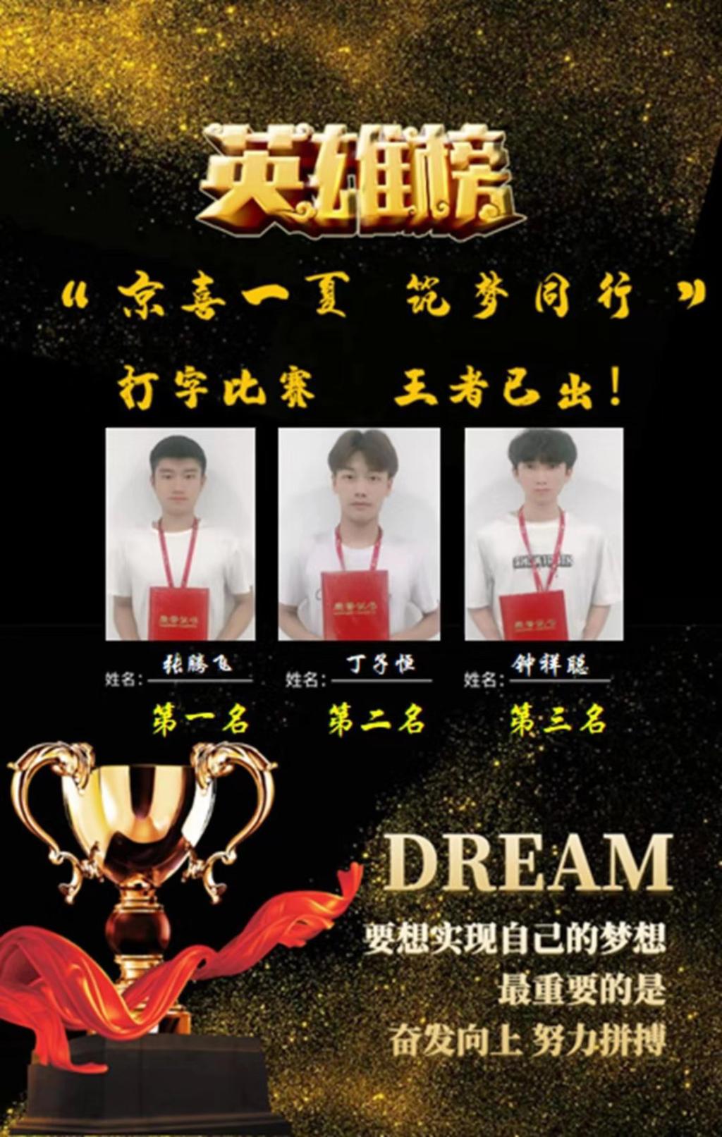 1.商学院丁子恒、王宁等十名学生参加“京喜一夏,筑梦同行”夏令营活动。张腾飞、丁子恒、温家琪、田杨琳四人荣获打字比赛八强。
