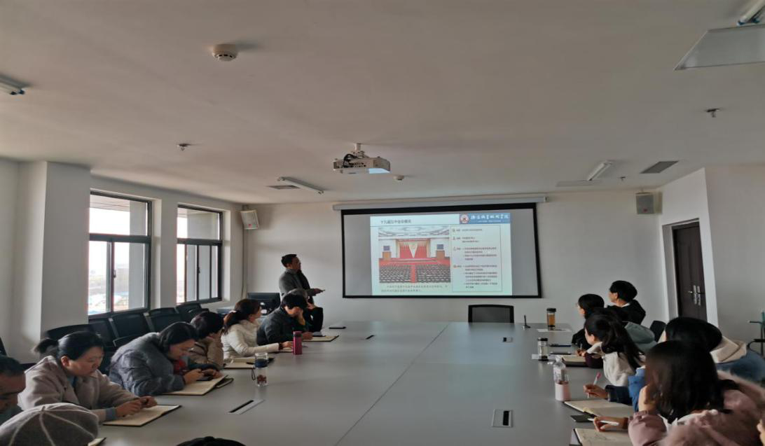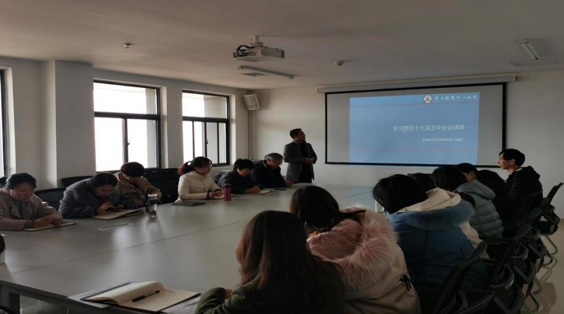 11月26日下午,澳门金年会app下载官网组织全体教职工在大学生活动中心四楼会议室进行十九届五中全会精神专题学习,学习活动以澳门金年会app下载官网党总支副书记马选宝讲党课的形式进行,由澳门金年会app下载官网党总支书记李向直主持。