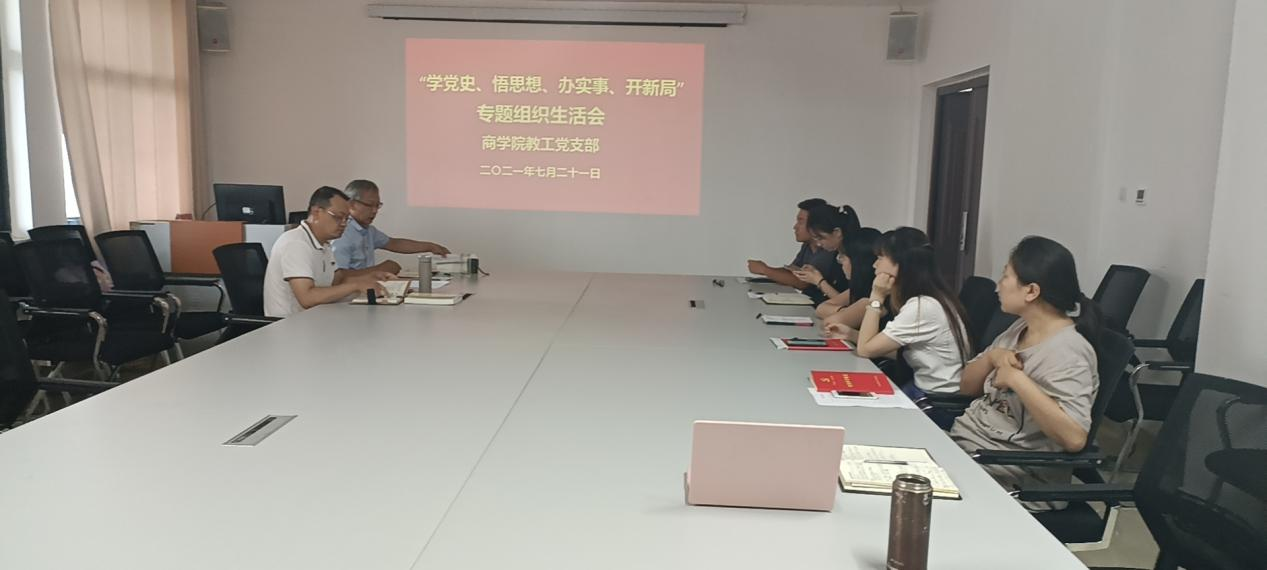 7月21日下午,澳门金年会app下载官网党总支在大学生活动中心四楼会议室召开“学党史、悟思想、办实事、开新局”专题组织生活会,会议由商学院党总支副书记马选宝主持,全体党员参加。因外出培训和汛情不能到场的党员,通过钉钉视频会议直播全程参与。