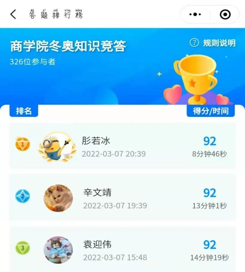 在本次冬奥知识竞答活动中,不少同学脱颖而出,展现出了自己冬奥知识储备的深厚积累,下面就来揭晓此处竞答活动的前三名吧。