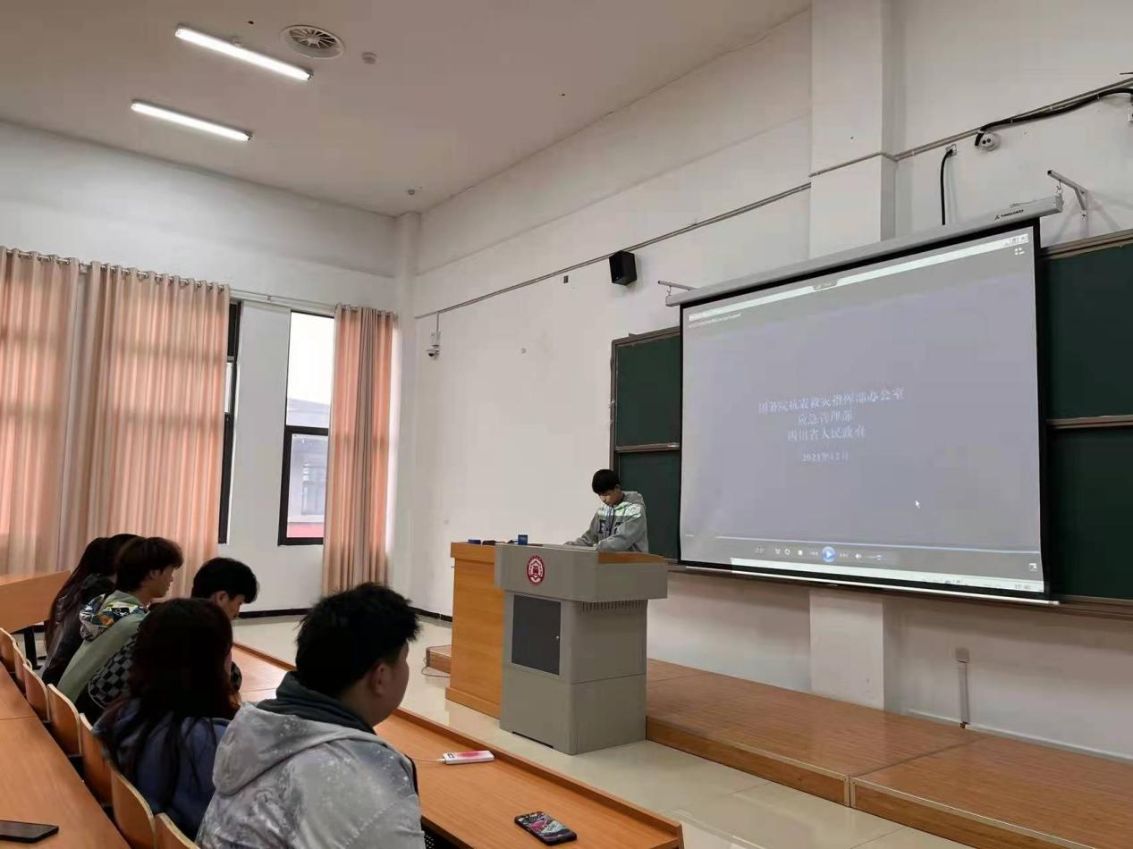 3月14日,为了让同学们学习抗震救灾知识,掌握自救互助技能。澳门金年会app下载官网澳门金年会app下载官网权益保障部组织各班班长、保卫委员,在2号教学楼407教室,观看《应急使命·2021》抗震救灾演习电视专题片。