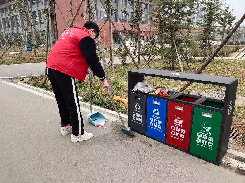 本次文明校园创建活动中,志愿者们怀揣着热血澎湃的心情,奔走在校园的各个角落。3人为一组有序进行,有的用扫帚清扫垃圾,有的拿着塑料袋捡拾垃圾,有的帮助环卫工人分类垃圾。他们的一次次蹲下起立,都在为提高校园文化生活质量贡献自己的力量,为校园文明程度做出自己的努力。